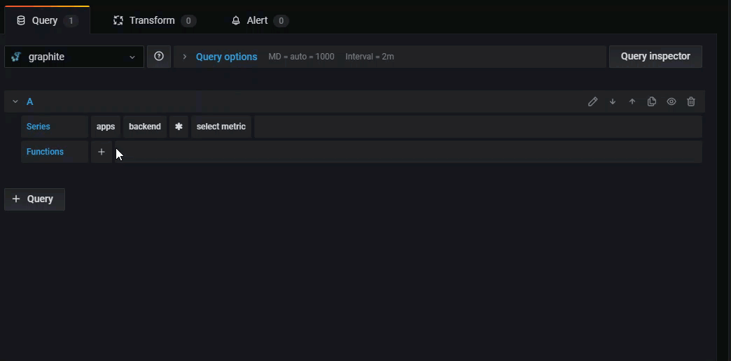 • Functions - Graphite uses functions to manipulate data. Click the + sign to view a list of functions in the drop-down. You can create a query with multiple functions.