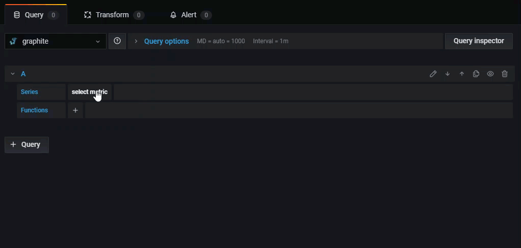 Grafana includes a Graphite-specific query editor to help you build queries. The query editor helps you quickly navigate the metric space, add functions, and change function parameters. It supports a variety of Graphite queries, including complex nested queries, through the use of query references.