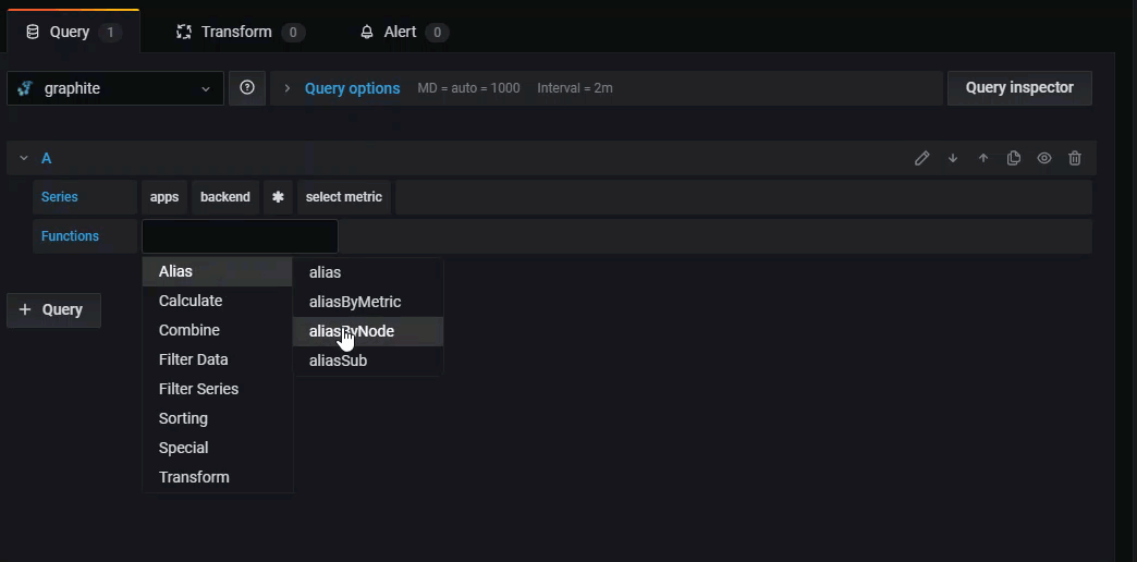 • Functions - Graphite uses functions to manipulate data. Click the + sign to view a list of functions in the drop-down. You can create a query with multiple functions.