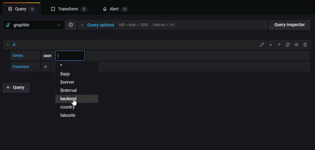 Grafana includes a Graphite-specific query editor to help you build queries. The query editor helps you quickly navigate the metric space, add functions, and change function parameters. It supports a variety of Graphite queries, including complex nested queries, through the use of query references.